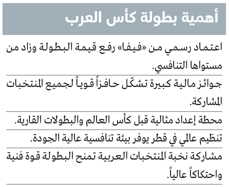 أكد رياضيون أن بطولة كأس العرب شهدت، خلال السنوات الأخيرة، ارتفاعاً ملحوظاً في أهميتها الفنية وقيمتها، وذلك من خلال خمسة أسباب تتعلق بالاعتراف الرسمي من «الفيفا»، والجوائز المالية، والتنظيم العالي، ومشاركة نخبة المنتخبات العربية، فضلاً عن تحولها من مجرد بطولة إقليمية إلى محطة إعداد أساسية للفرق المتأهلة إلى كأس العالم.