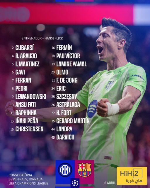 هاي كورة – أعلن المدرب الألماني هانز فليك، قائمة برشلونة الرسمية لمواجهة إنتر ميلان، غدًا الثلاثاء، ضمن منافسات إياب نصف نهائي دوري أبطال أوروبا.