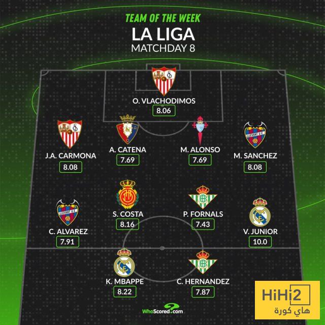 هاي كورة – كشف موقع هوسكورد عن التشكيلة المثالية للجولة الثامنة من بطولة الدوري الإسباني، والتي شهدت فوز ريال مدريد على فياريال بنتيجة 3-1، وهزيمة برشلونة ضد إشبيلية 4-1.