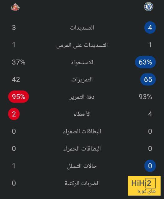 إحصائيات 20 دقيق بين تشيلسي و سندرلاند: