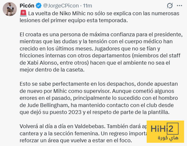 هذا الأمر معروف جيدًا في مكاتب النادي، حيث تم اختيار ميهيتش مجددًا كمشرف ، ورغم ارتكابه بعض الأخطاء في الماضي، أبرزها إصابة جود بيلينغهام في كتفه، إلا أنه حافظ على تواصله مع النادي منذ مغادرته منصبه عام 2023، ويحظى باحترام شريحة كبيرة من اللاعبين .