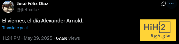 هاي كورة- أكد الصحفي خوسيه فيليكس دياز أن اليوم الجمعة الموافق 30 مايو هو يوم الاعلان عن تعاقد ريال مدريد مع ترينت الكسندر ارنولد قادما من صفوف ليفربول .