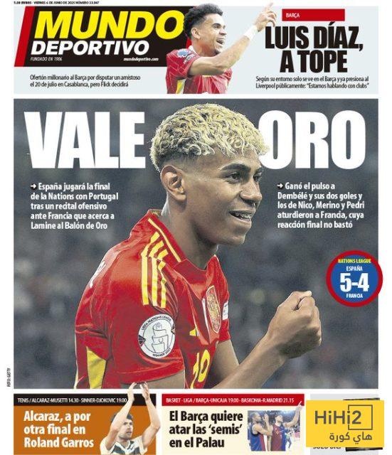 هاي كورة – عنونت صحيفة الموندو الكتالونية عبر غلاف عددها الصادر اليوم الجمعة ” يستحق الذهب” في إشارة للامين يامال ، وذلك بعد أدائه المميز وبصمته في تأهل منتخب إسبانيا لنهائي دوري الأمم الأوروبية.