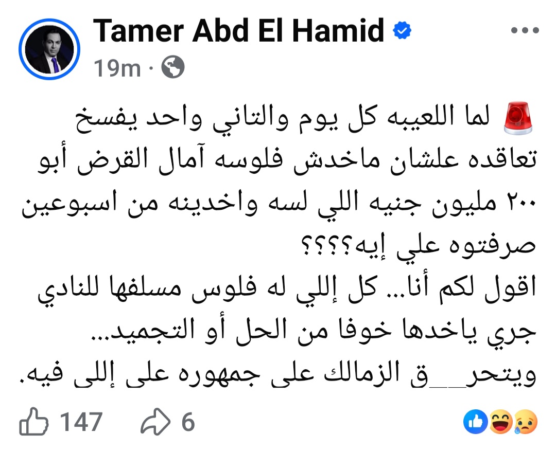 “كل يوم والتاني واحد يفسخ عقده عشان ماخدش فلوسه… آمال القرض اللي خدناه من أسبوعين 200 مليون جنيه، صرفتوه على إيه؟! والله كل إللي له فلوس مسلفها للنادي جري ياخدها خوفا من الحل أو التجميد… الزمالك اتحرق على جمهوره من جوه!”