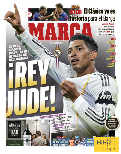 هاي كورة- وصفت صحيفة ماركا الاسبانية جود بيلينغهام ، نجم ريال مدريد ، بالملك وعنونت على غلافها اليوم الاثنين 3 نوفمبر 2025 :