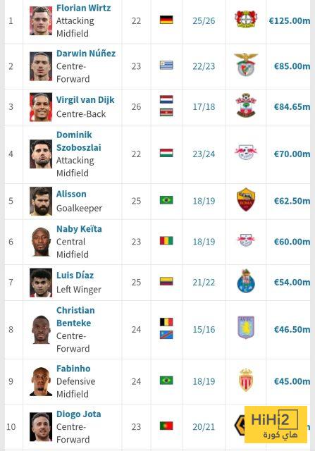 والآن تراجع داروين نونيز للمركز الثاني بـ85 مليون يورو، ثم جاء فيرجيل فان دايك ثالثًا بـ84.6 مليون يورو.