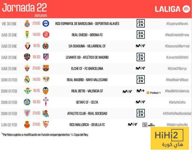 في المقابل، تقاك مباراة ريال مدريد ضد رايو فاليكانو في الرابعة من مساء الأحد بتوقيت مكة المكرمة.