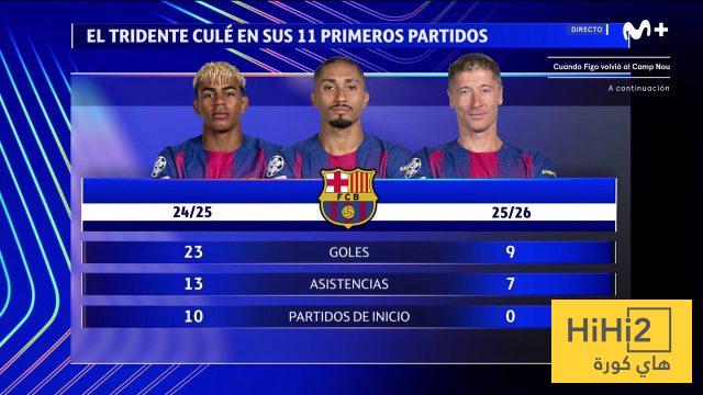هاي كورة: أوضحت الاحصائيات تراجع كبير في أرقام ثلاثي برشلونة الهجومي لامين يامال، رافينيا وليفاندوفسكي في أول 11 مباراة هذا الموسم مقارنة بأرقام الموسم الماضي.