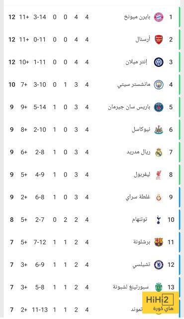 ويتصدر بايرن ميونخ ، أرسنال ، وإنتر ميلان جدول ترتيب دوري الأبطال حتى الآن ، برصيد 12 نقطة ، بعد تحقيقهم الفوز في أول 4 جولات .