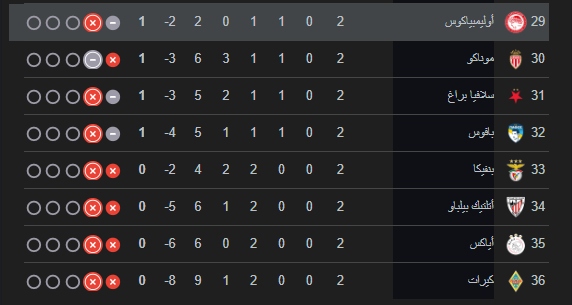 أوليمبياكوس في المركز الـ 29 من ترتيب دوري ابطال اوروبا .