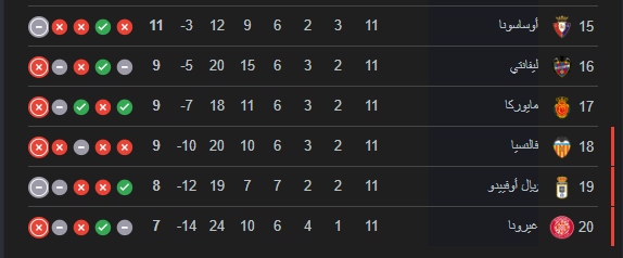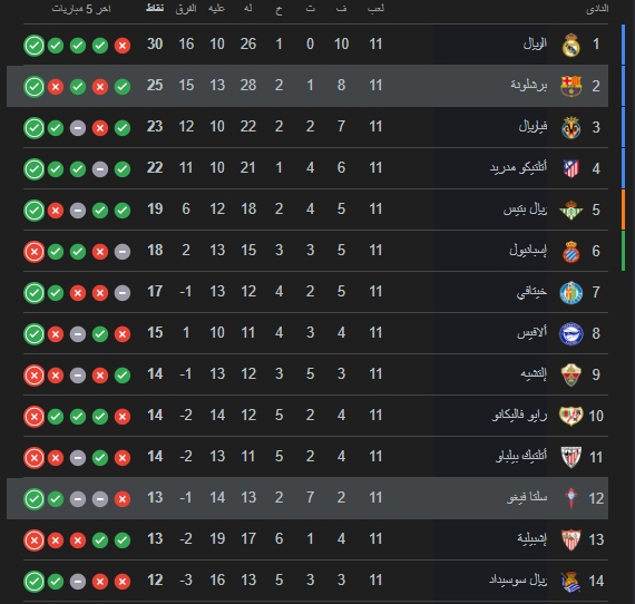 سيلتا فيغو في المركز الثاني عشر من ترتيب الليغا برصيد 13 نقطة .