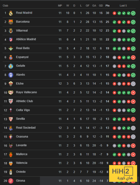 ريال مدريد في المركز الأول من ترتيب الليغا برصيد 30 نقطة .