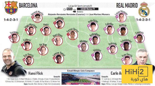 هاي كورة – هاي كورة – كشفت صحيفة الماركا الإسبانية عن التشكيلة المتوقعة للكلاسيكو في الجولة الخامسة والثلاثين من الليغا حيث يسعى كلا من كارلو أنشيلوتي وهانز فليك لقيادة الفريقين لتحقيق الفوز ، خاصة مع الصراع بينهما على اللقب حيث يعتلي البارسا الصدارة بفارق أربع نقاط عن البلانكو.