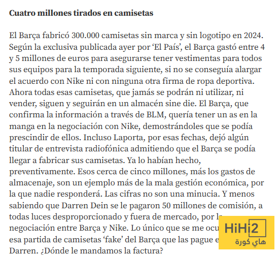 برشلونة أكد هذه المعلومات ، مُدعيًا رغبته في الاحتفاظ بورقة رابحة في المفاوضات مع نايكي ، مُظهرًا قدرته على الاستغناء عنها ، تُعد هذه القمصان التي تُقارب 5 ملايين يورو ، بالإضافة إلى تكاليف التخزين ، مثالًا آخر على سوء الإدارة المالية ، الذي لن يُحاسب عليه أحد .