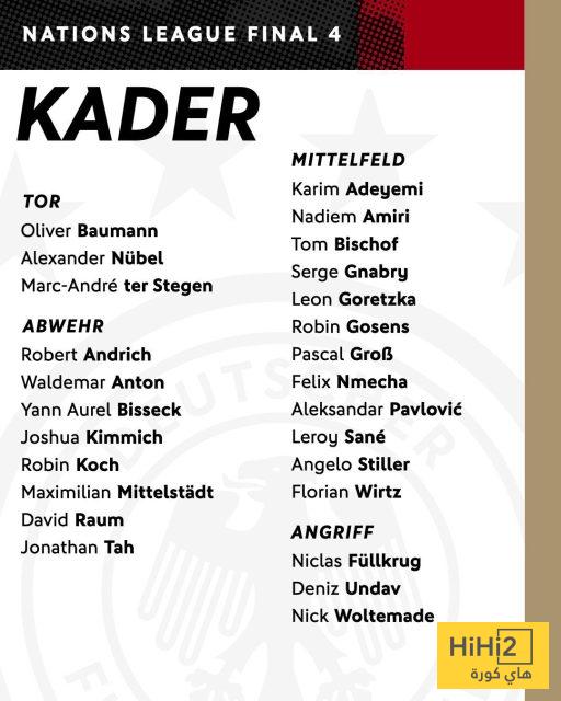هاي كورة – أعلن الاتحاد الألماني لكرة القدم عن القائمة الرسمية للمنتخب الأول، استعدادًا لمواجهة نظيره البرتغالي في نصف نهائي دوري الأمم الأوروبية، وشهدت التشكيلة مزيجًا من العناصر الشابة والمخضرمة، بقيادة الحارس مارك-أندريه تير شتيغن.