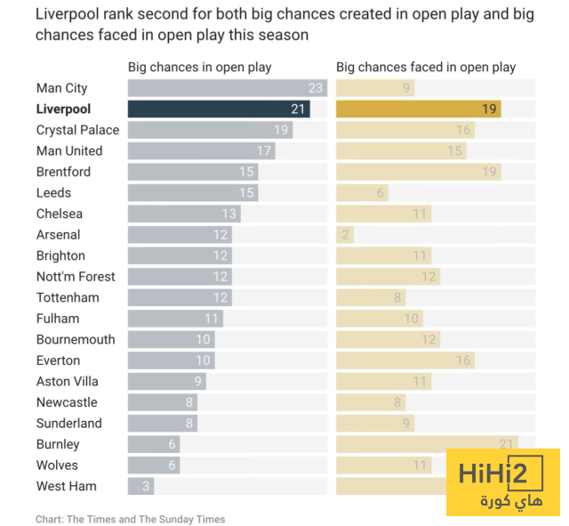 على الجانب الآخر ، أوضحت الإحصائية أن ليفربول يعاني دفاعيًا كثاني أكثر الفرق تأثرًا بتهديد الفرص المحققة، حيث صنعت الفرق المنافسة 19 فرصة كبيرة على مرماه خلال الجولات الماضية.