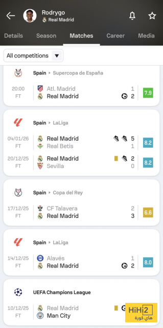 روريغو جوس مع ريال مدريد بين فبراير و9 ديسمبر 2025 :