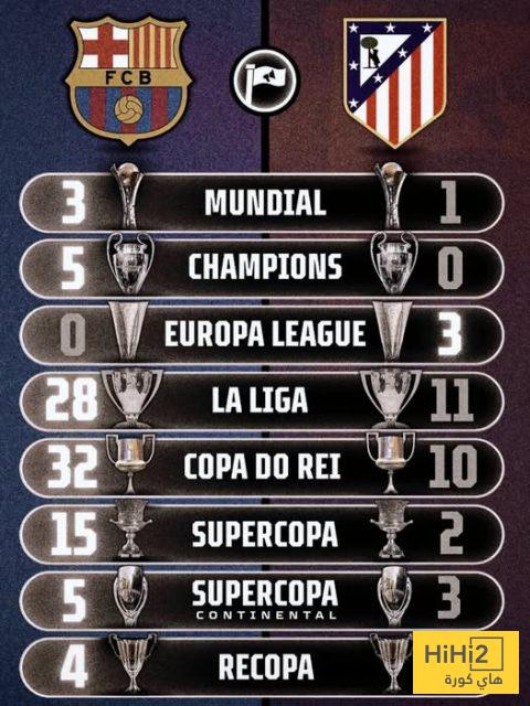 رصيد برشلونة وصل حتى الان الى 92 لقبا لمختلف البطولات متفوقا على اتلتيكو مدريد بفارق 61 لقبا حيث توج النادي المدريدي ب31 لقبا و هو ما تظهره الصورة المرفقة .