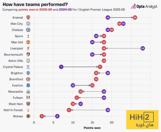 ارسنال جمع الموسم المنصرم 19 نقطة بينما الموسم الحالي وصل رصيده الى 26 نقطة في حين ان حامل اللقب ليفربول سجل تقهقرا رهيبا بعدما بلغ الفارق 10 نقاط حيث نزل من 28 نقطة الى 18 نقطة مما ادى الى تراجعه في الترتيب الحالي و تقلص حظوظه في الاحتفاظ بتاجه .
