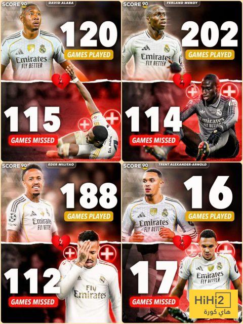 المدافع الانجليزي اكتفى بلعب 16 مباراة مقابل غيابه عن 17 مباراة و قبله النمساوي دافيد الابا لعب 120 مباراة و غاب عن 115 مباراة بينما البرازيلي ايدر ميليتاو غاب عن 112 مباراة و لعب 188 في حين ان الفرنسي ميندي لعب 202 مباراة و غاب عن 114 مباراة و هو رقم مرشح للزيادة حتى تعافيه و عودته للملاعب في العام الجديد .