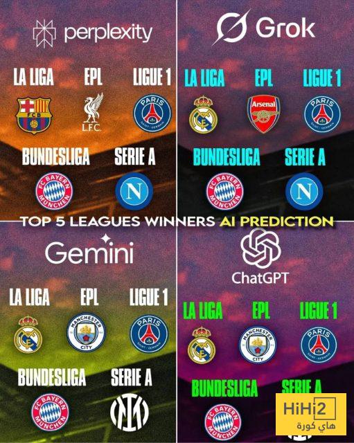 رصدت اربعة برامج للذكاء الاصطناعي توقعاتها بشان ابطال الدوريات الاوروبية الخمسة الكبرى خلال الموسم الجديد 2025-2026 الذي ينطلق بعد ايام قليلة .