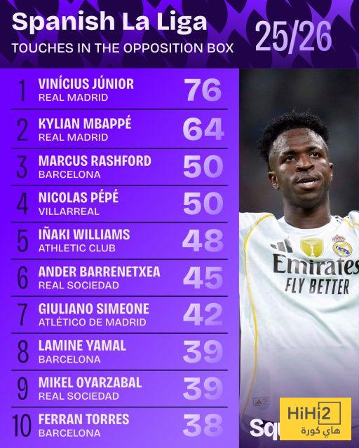 هاي كورة: تصدر نجم ريال مدريد فينيسيوس جونيور قائمة أكثر اللاعبين لمسًا للكرة في منطقة جزاء الخصوم في الليغا هذا الموسم برصيد 76 مرة.