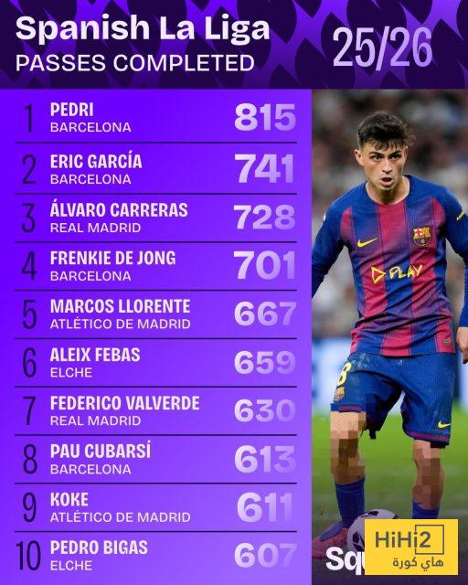 يأتي خلفه إريك غارسيا مدافع برشلونة بـ741 تمريرة ، ثم ألفارو كاريراس ظهير ريال مدريد بـ 728 تمريرة .