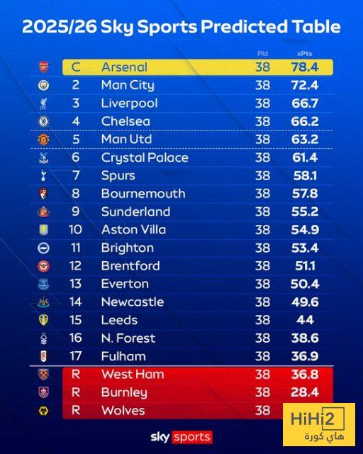 هاي كورة – كشفت شبكة سكاي سبورت عن توقعاتها للشكل النهائي لجدول الدوري الإنجليزي بنهاية الموسم الجاري حيث تصدر الأرسنال ، محققا اللقب بـ 78.4 نقطة .