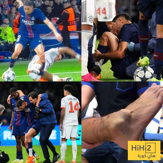 هاي كورة – أصيب أشرف حكيمي ، نجم باريس سان جيرمان ، بإصابة بالغة في الكاحل ، وذلك إثر تدخل عنيف من لويس دياز .