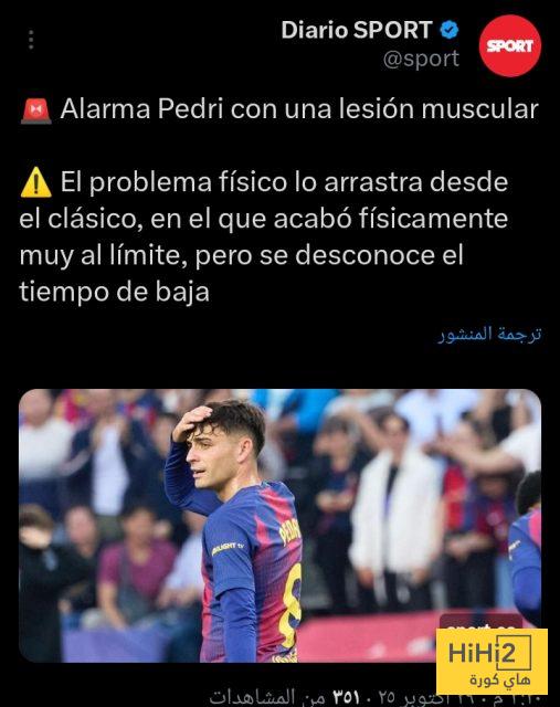 هاي كورة – أكد تقرير صحيفة السبورت الكتالونية تعرض بيدري جونزاليس لاعب برشلونة لإصابة عضلية و إجهاد عام في جسده ، مما جعله يغيب عن التدريبات الجماعية اليوم في مقر المدينة الرياضية .