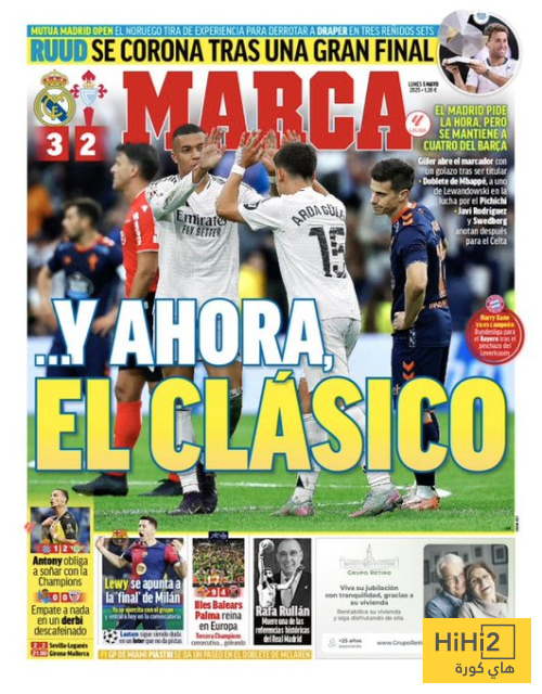 هاي كورة- تصدر فوز ريال مدريد على سليتا فيغو (3-2) مساء امس الاحد غلاف صحيفة ماركا الاسبانية .