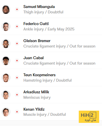 ويأتي في مقدمة الغيابات، النجم التركي كينان يليديز، وكذلك فيديريكو غاتي وجيلسون بريمير.
