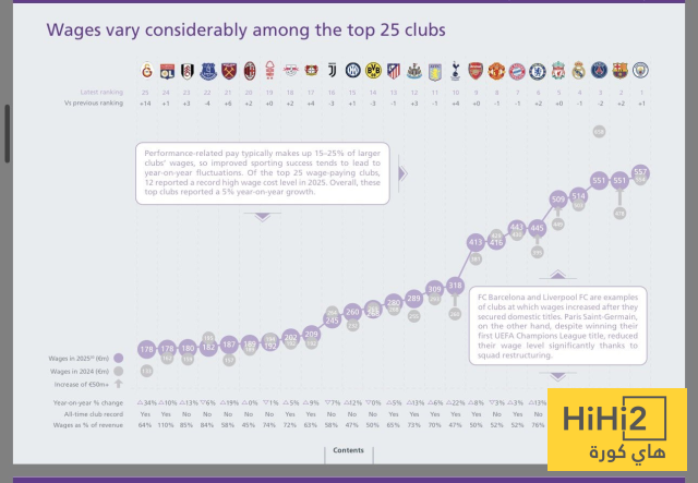 هاي كورة – أظهرت أحدث التقارير المالية لشركة ديلويت أن برشلونة أصبح ثاني أعلى الأندية الأوروبية إنفاقًا على الرواتب بعد مانشستر سيتي، حيث ارتفعت فاتورة الرواتب في النادي الكتالوني من 478 مليون يورو في 2024 إلى 551 مليون يورو في 2025، بزيادة قدرها 73 مليون يورو خلال عام واحد.