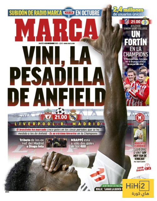 هاي كورة- الاحصائيات الرائعة لـ فينيسيوس جونيور نجم الريال تصدرت غلاف صحيفة ماركا الاسبانية اليوم الثلاثاء 4 نوفمبر 2025 .