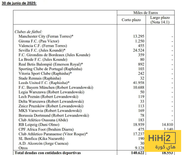 هاي كورة- كشفت صحيفة ماركا الاسبانية عن إجمالي ديون برشلونة التي يجب سدادها للاندية الآخرى مقابل التعاقدات مع عدد من اللاعبين الحاليين في الفريق الذي يدربه هانسي فليك بالاضافة الى لاعبين آخرين لم يعودوا ضمن التشكيلة الاساسية.