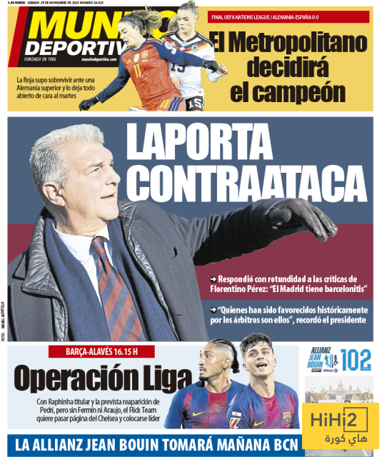 هاي كورة – تصدر خوان لابورتا رئيس برشلونة غلاف صحيفة موندو ديبورتيفو الاسبانية اليوم السبت 29 نوفمبر 2025 .