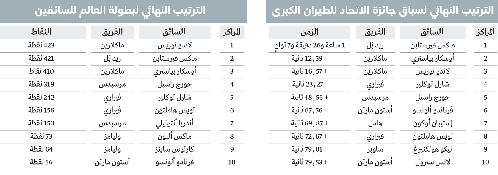 وحسمت جولة أبوظبي اللقب الأخير في الموسم على صعيد بطولة العالم للسائقين، بعد أن عزز السائق البريطاني لاندو نوريس صدارته لبطولة العالم بإجمالي 423 نقطة، متفوقاً بفارق نقطتين فقط عن ماكس فيرستابن الذي أنهى موسمه الحالي بالمركز الثاني بإجمالي 421 نقطة، فيما أنهى سائق «ماكلارين» أوسكار بياسري الموسم في المركز الثالث برصيد 410 نقاط.