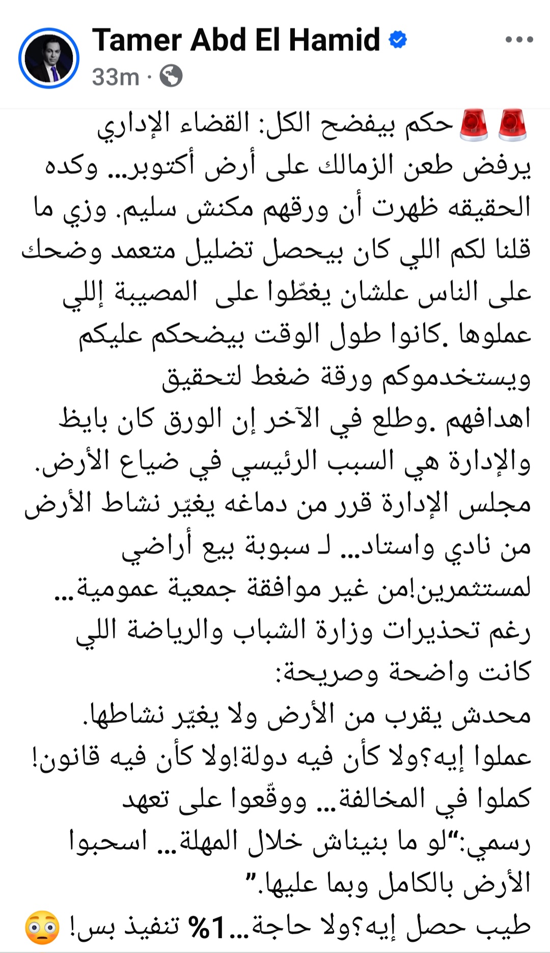 وأكد أن حكم قضائي تاريخي كشف المستور، رفضت محكمة القضاء الإداري طعن نادي الزمالك بشأن أرض مدينة أكتوبر، ليوجه القضاء ضربة قاصمة لمحاولات التضليل التي استمرت لسنوات، الحكم لم يكن مجرد قرار إداري، بل كان بمثابة شهادة وفاة لروايات الإدارة السابقة والحالية التي حاولت تجميل صورة الموقف القانوني للأرض.