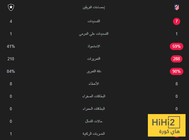 هاي كورة- انتهى الشوط الاول من مباراة اتلتيكو مدريد ضد بوتافوغو المقامة الآن بالتعادل السلبي بدون اهدف ، ضمن منافسات الجولة الثالثة من دور المجموعات ببطولة مونديال الاندية.