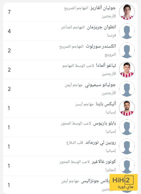 هاي كورة : يتصدر النجم ، جوليان الفاريز ، قائمة هدافي نادي أتلتيكو مدريد في بطولة الدوري الإسباني هذا الموسم برصيد 7 أهداف ، وجاءت القائمة كالتالي :