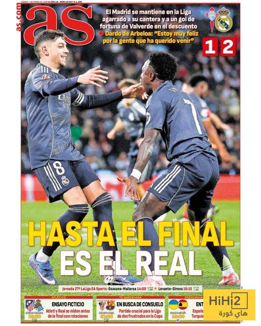 هاي كورة : تصدر فوز ريال مدريد على سيلتا فيغو في الدوري الإسباني بنتيجة 2/1 غلاف صحيفة آس اليوم ، وكتبت الصحيفة :